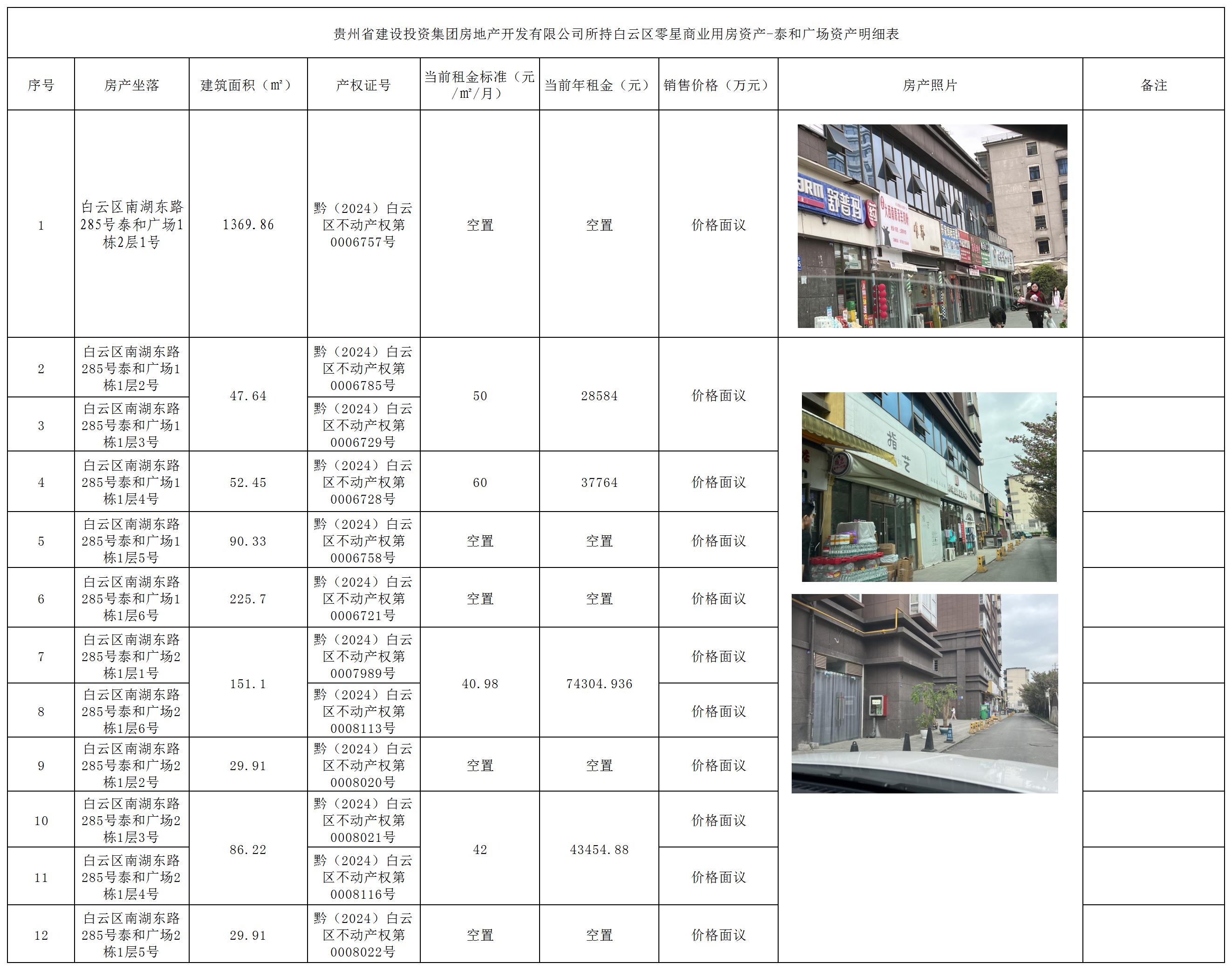 貴州省建設(shè)投資集團(tuán)房地產(chǎn)開(kāi)發(fā)有限公司(以下簡(jiǎn)稱(chēng):貴州建投房開(kāi))所持白云區(qū)零星商業(yè)用房資產(chǎn)項(xiàng)目分別位于泰和花園449號(hào)、泰和花園433號(hào)、泰和大廈和泰和廣場(chǎng)四宗。
