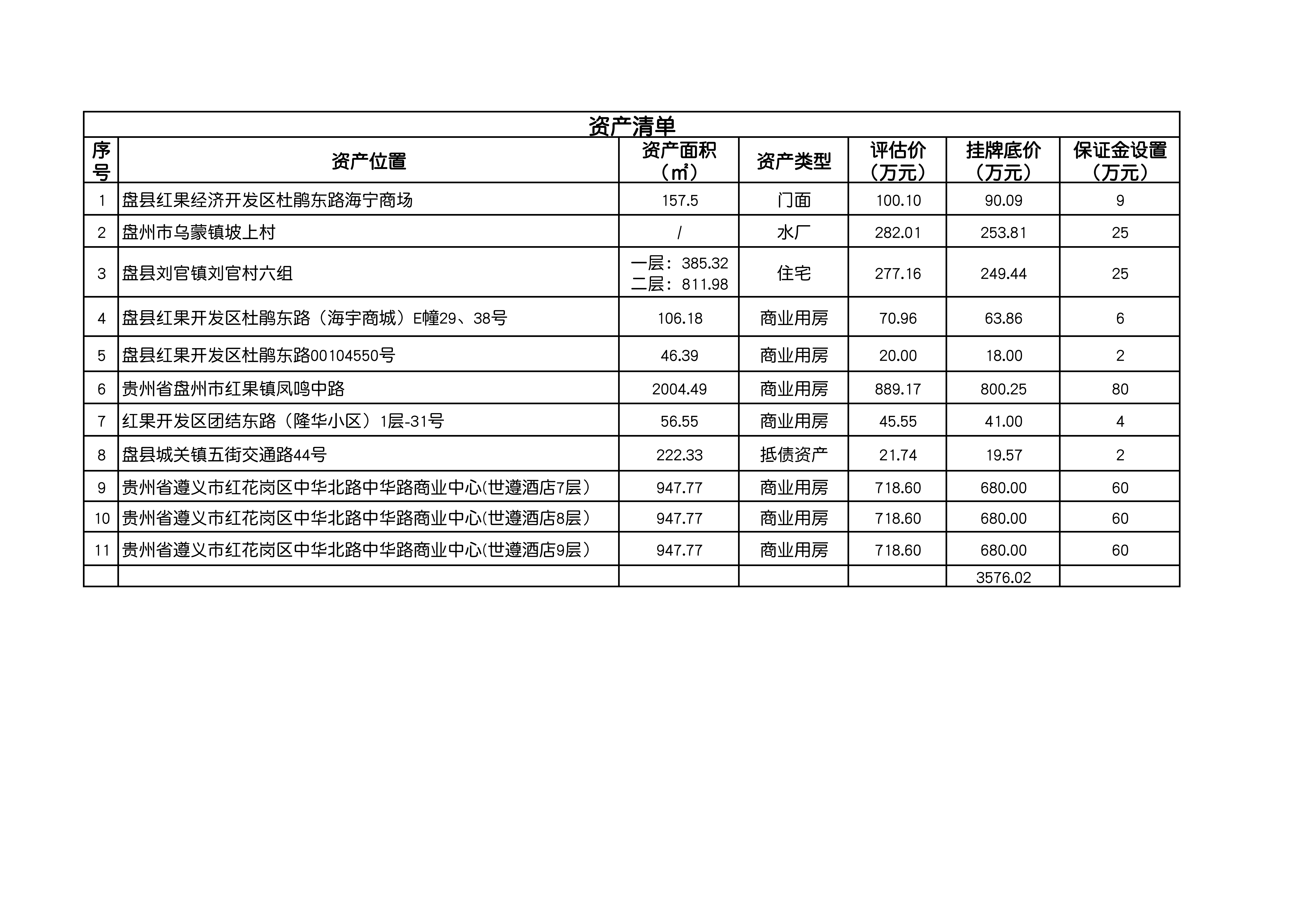 | 資產(chǎn)公告信息 | 資產(chǎn)描述 | 本次擬轉(zhuǎn)讓的資產(chǎn)共計(jì)11處,8宗資產(chǎn)位于貴州省盤州市、3宗資產(chǎn)位于貴州省遵義市紅花崗區(qū)中華北路中華路商業(yè)中心(各標(biāo)的情況詳見附件清單) | ||||||