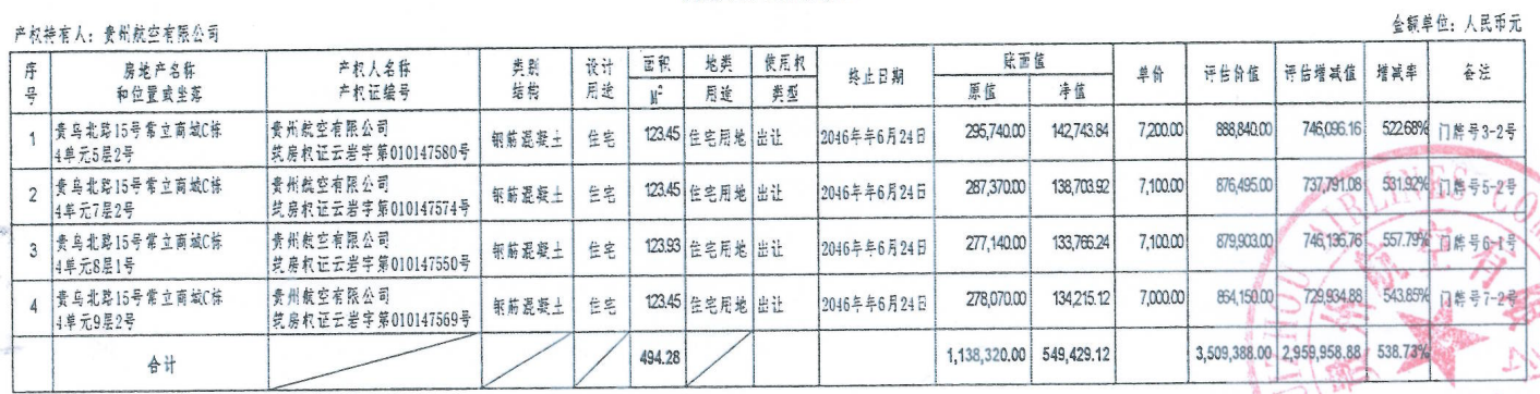 | 資產(chǎn)公告信息 | 資產(chǎn)描述 | 本次標(biāo)的為貴州航空有限公司持有的貴州省貴陽(yáng)市貴烏北路15號(hào)常立商城四套住宅: 貴州省貴陽(yáng)市貴烏北路15號(hào)常立商城4單元5層2號(hào),建筑面積123.45(㎡),總價(jià)888840(元); 貴州省貴陽(yáng)市貴烏北路15號(hào)常立商城4單元7層2號(hào),建筑面積123.45(㎡),總價(jià)876495(元); 貴州省貴陽(yáng)市貴烏北路15號(hào)常立商城4單元8層1號(hào),建筑面積123.93(㎡),總價(jià)879903(元); 貴州省貴陽(yáng)市貴烏北路15號(hào)常立商城4單元9層2號(hào),建筑面積123.45 (㎡),總價(jià)864150(元)。 | |||||