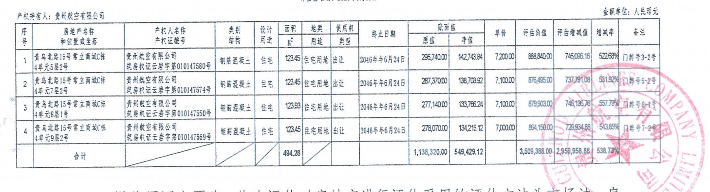 | 資產(chǎn)公告信息 | 資產(chǎn)描述 | 本次標(biāo)的為貴州航空有限公司持有的貴州省貴陽市貴烏北路15號常立商城四套住宅: 貴州省貴陽市貴烏北路15號常立商城4單元5層2號,建筑面積123.45(㎡),總價888840(元); 貴州省貴陽市貴烏北路15號常立商城4單元7層2號,建筑面積123.45(㎡),總價876495(元); 貴州省貴陽市貴烏北路15號常立商城4單元8層1號,建筑面積123.93(㎡),總價879903(元); 貴州省貴陽市貴烏北路15號常立商城4單元9層2號,建筑面積123.45 (㎡),總價864150(元)。 | |||||